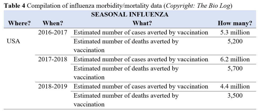 There is also the seasonal flu vaccine – an annual vaccine that is developed based on the strain of influenza that is present in that particular year. Table 4 shows that millions of cases and deaths due to influenza infection are averted every year. Fluctuation of figures may occur due to a few reasons including the resistance strength of the strain in that particular year as well as varying vaccination coverage or access in a particular country or geographic area.