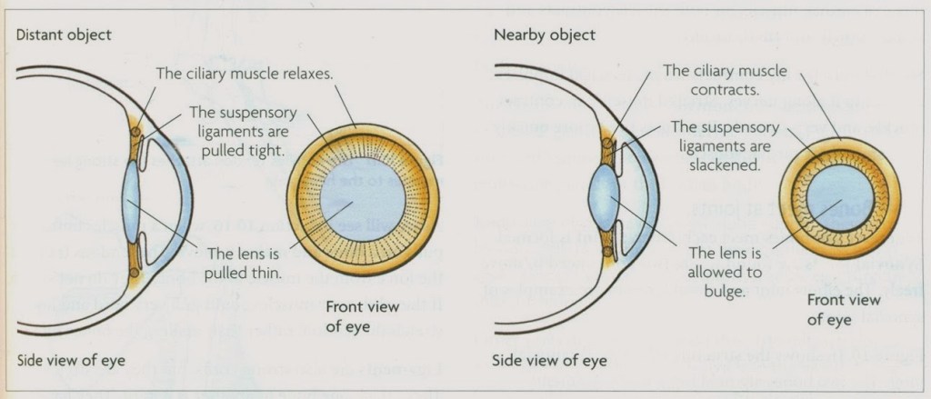 With the help of the eye muscles and ligaments, the lens is pulled thin when focusing light from distant objects, and allowed to thicken when focussing light from nearby objects.