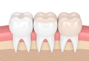 - crown, where a custom-made covering is fitted onto the top of the tooth to replace its original crown. This is usually done where decay has progressed to a point where the tooth is significantly damaged or weakened. The dentist usually drills out the entire damaged part of the tooth prior to fixing the crown. Porcelain, resin, metal, or a combination may be used.
