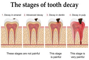 Dental caries – cavities or tooth decays, as they are commonly known – are caused by harmful bacteria in our mouth that feed on sugar and starch in food we consume, and produce acids as a by-product. Over time, these acids could attack and damage the teeth, starting with the enamel and working their way further inside if not dealt with. The image below shows a simple illustration of this phenomenon.