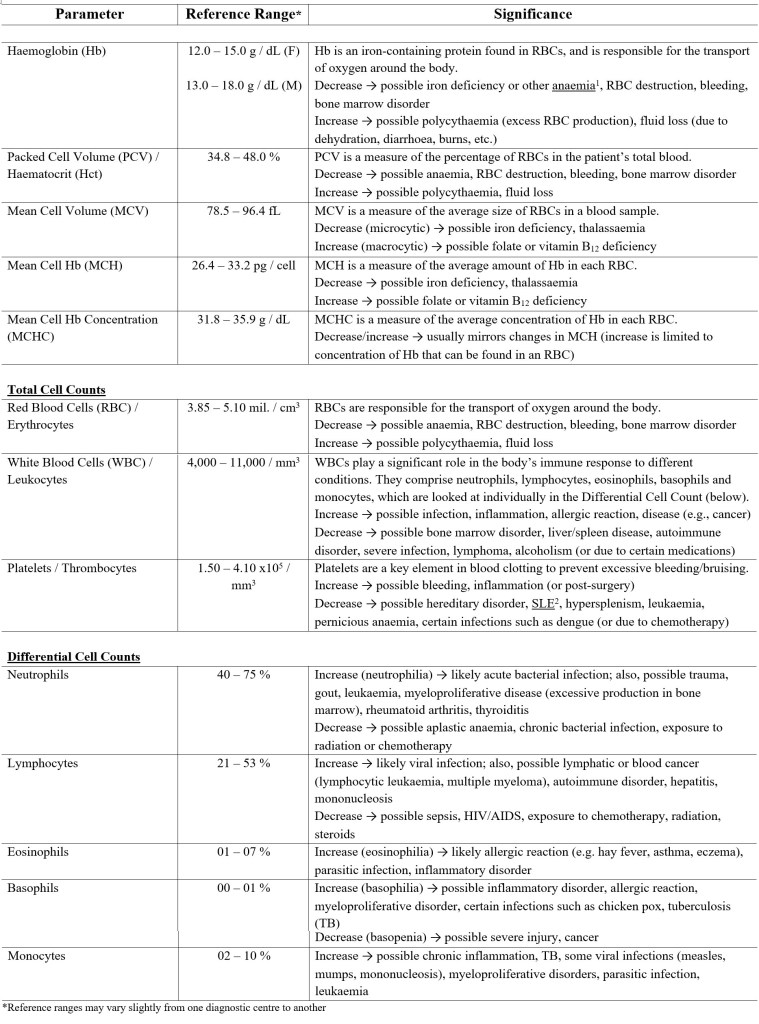 Let’s take a closer look at what we usually look at in an FBC report. Table 1 shows the parameters that are tested for and discusses potential reasons for increase or decrease beyond the respective reference ranges. The reference ranges (for adults) mentioned here are those followed by my family GP. Please note that reference ranges may vary slightly from one laboratory to another, so it is best to get your test done at a diagnostics centre recommended by your doctor.