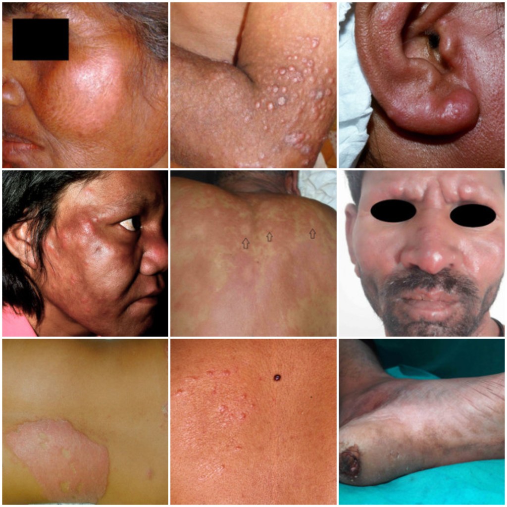 - enlarged nerves, mostly around the sides of neck, elbows and knees