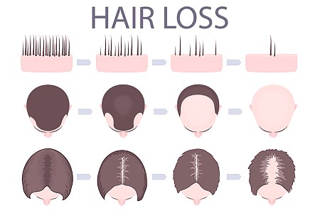 - androgenic alopecia – more commonly referred to as hereditary hair loss, where inherited genes may cause hair follicles to shrink and stop generating hair at some point of time in life. This may be differentiated as: