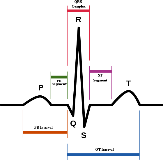Pumping blood from the atria to the ventricles, and then out from the heart involves a coordinated sequence of events that include the opening and closing of the above-mentioned valves, as well as contraction of the heart’s muscular walls. These activities are controlled by a series of electrical impulses, which is what we read in an electrocardiogram, or ECG. Illustrated below is an ideal voltage-versus-time graph for the electrical activity in a single heartbeat. This involves three main components: P wave (depolarisation of atria), QRS complex (depolarisation of ventricles), T wave (repolarisation of ventricles).