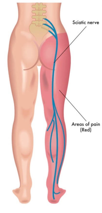 - herniated/slipped disc – This is the most common cause of sciatica. Vertebral discs are pads that lie between the vertebrae of the vertebral column (spine). They have a gel-like centre and act like a cushion, preventing friction between vertebrae and helping to keep them in place. In the event that the outer wall of a disc weakens, vertebral pressure can cause the gel-like centre to herniate (bulge out). If such herniation occurs in the lower back, it could press on the sciatic nerve and subsequently lead to sciatica.