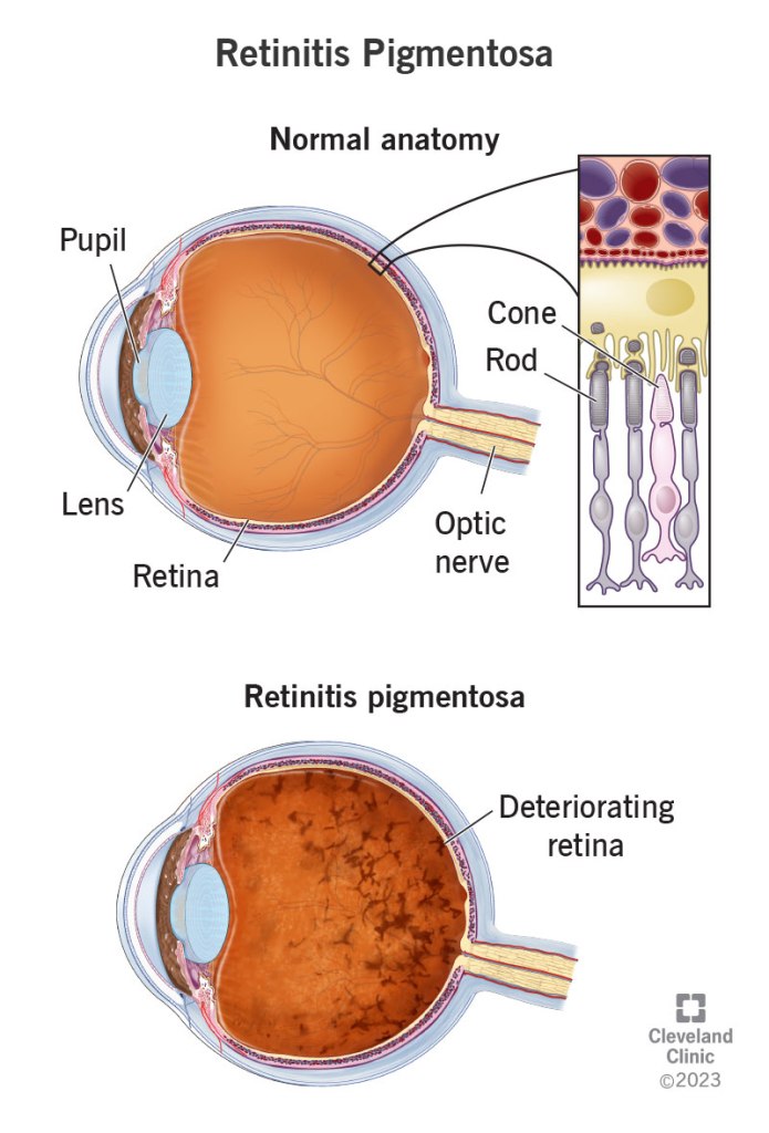 In rare cases, RP may also be caused by some medicines, eye infection or injuries, or may be linked to other genetic conditions such as Usher Syndrome, which causes both hearing and vision loss.